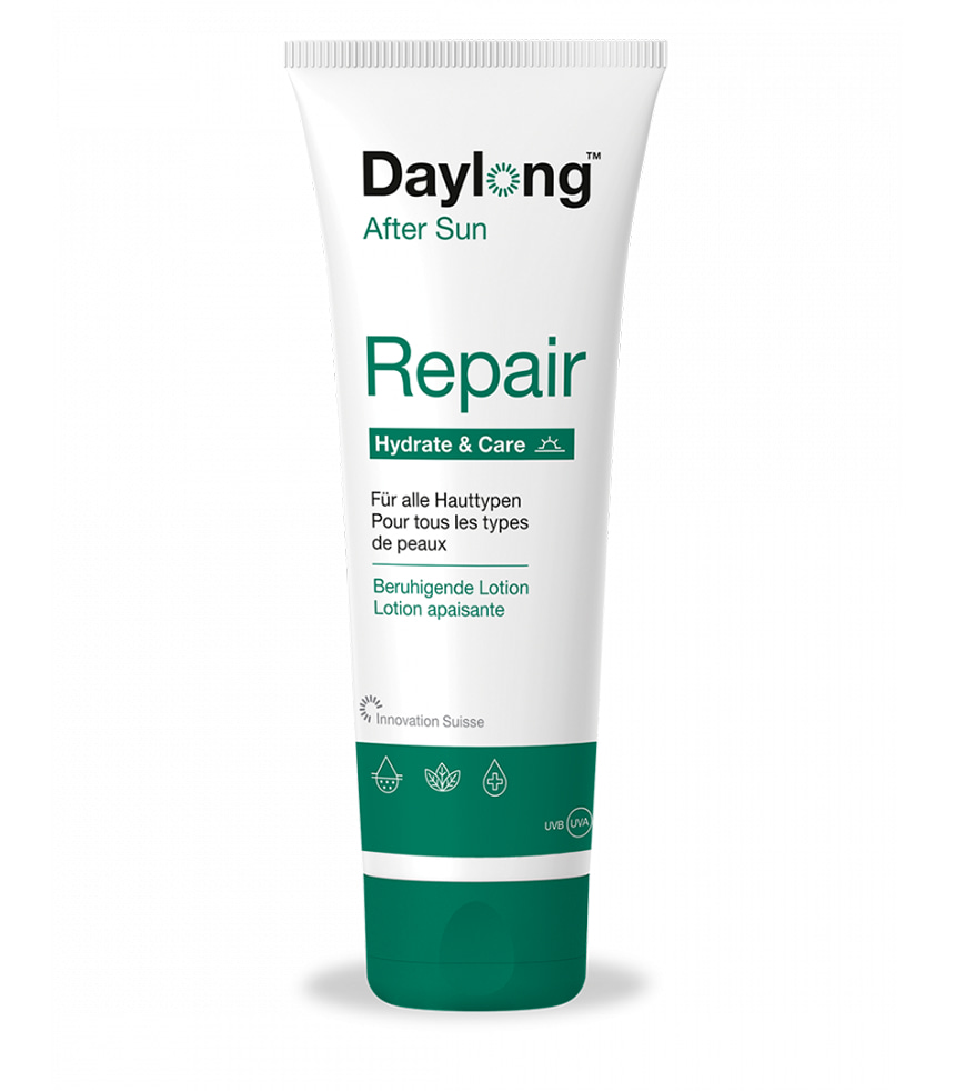 Daylong™ After Sun Repair : pour la régénération de la peau après un bain de soleil avec effet bien-être. Ce lait rafraîchissant ne se contente pas d’apporter à votre peau l’hydratation dont elle a besoin. Sa forte teneur en lipides assure un effet relipidant et laisse ainsi globalement une sensation agréable sur votre peau. Mais Daylong After Sun en fait encore bien plus pour votre peau : sa formulation liposomale (molécules dont la structure est semblable à celle de la peau) apporte à votre peau de l’endonucléase, une enzyme de réparation de l’ADN, et favorise ainsi de manière active la régénération naturelle de la peau.